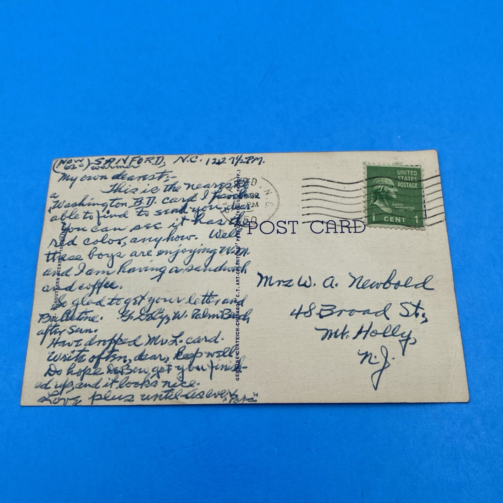 Original Curt Teich C.T. Art-Colortone linen postcard titled “DINNERTIME” with stock number S.524 and production code 6A-H456 printed on the card—placing first issue in 1936. This example was mailed from Sanford, North Carolina in 1950 with the correct 1¢ George Washington (1938 Presidential/Prexie, Scott 804) postcard rate. Addressed to Mrs. W. A. Newbold, 48 Broad St., Mt. Holly, N.J. The handwritten note opens “My own dearest—,” mentions being in Sanford, N.C. around 12½ PM, comments on the scene, and notes grabbing a sandwich and coffee before an affectionate close.