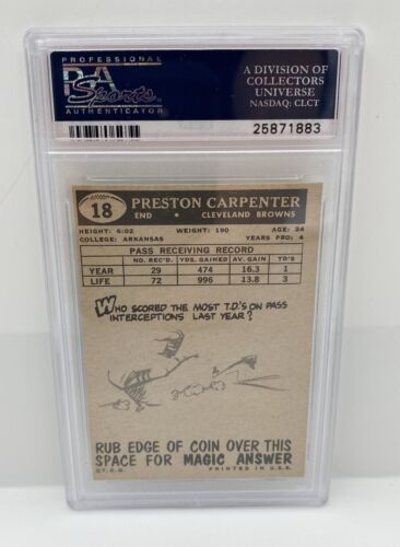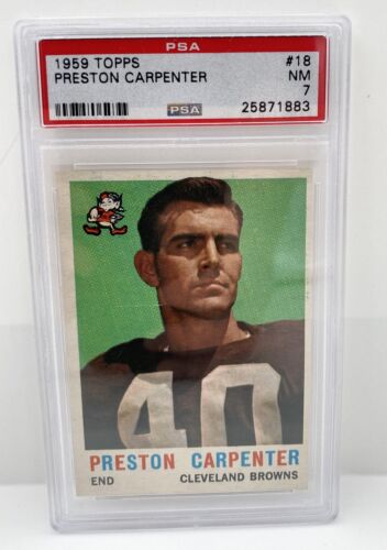 This 1959 Topps #18 trading card features the talented Preston Carpenter of the Cleveland Browns. With a PSA 7 rating, this original card is a must-have for any serious collector of sports memorabilia. The card showcases Carpenter in his prime, making it a great addition to your collection of football trading cards.