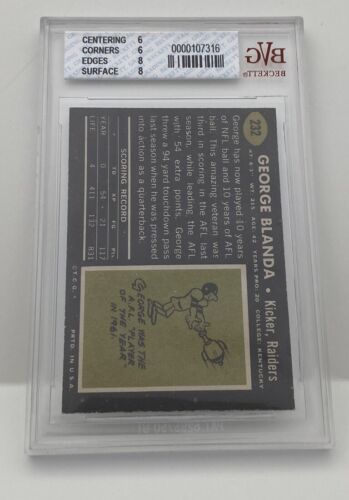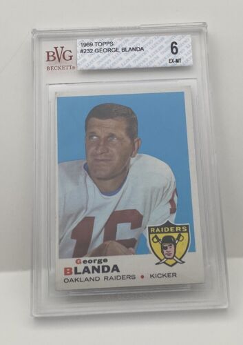 This is a 1969 Topps football trading card featuring George Blanda, the legendary quarterback of the Oakland Raiders. The card has been graded BVG 6 and comes from an original set, making it a great addition to any vintage football card collection.