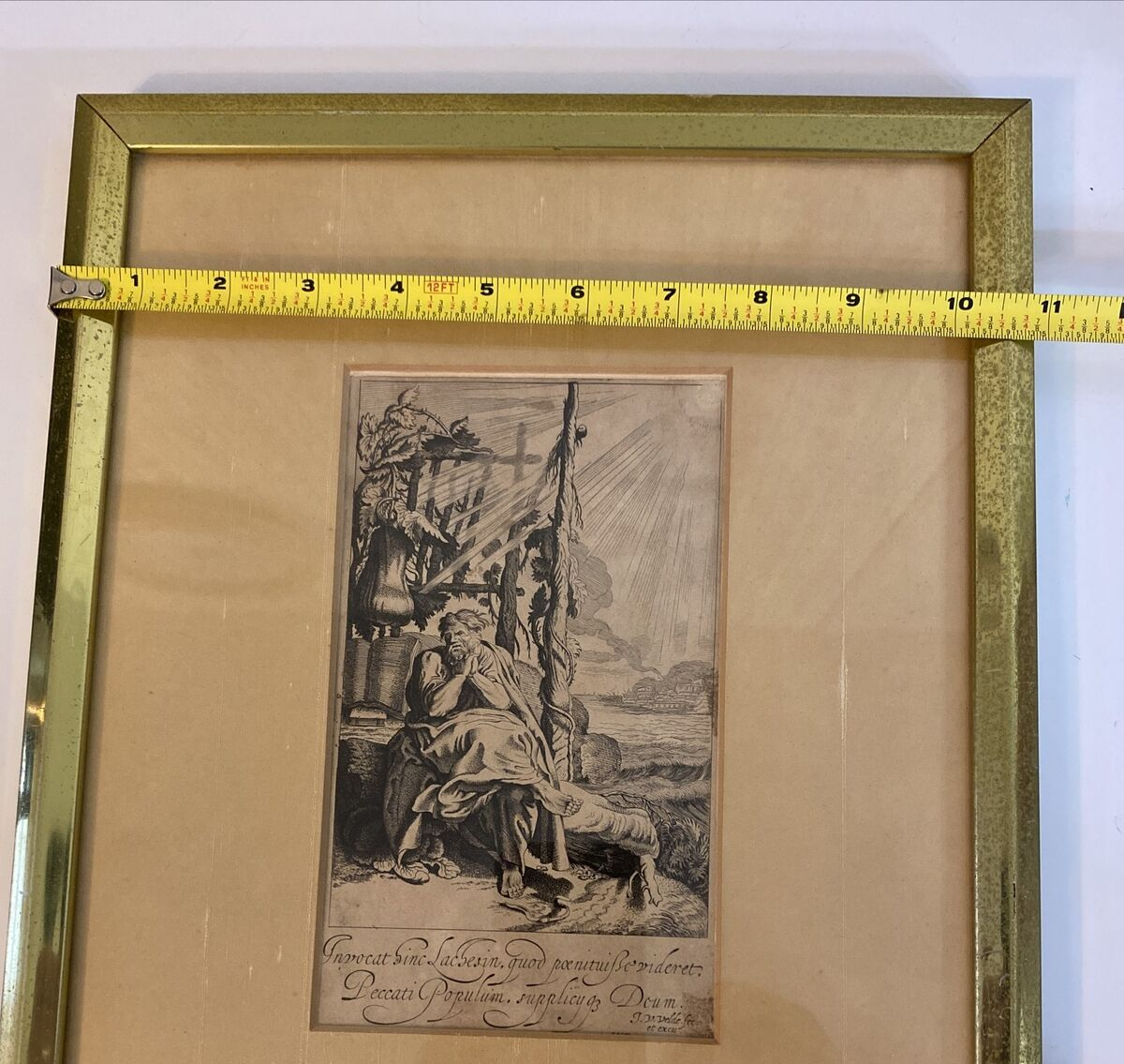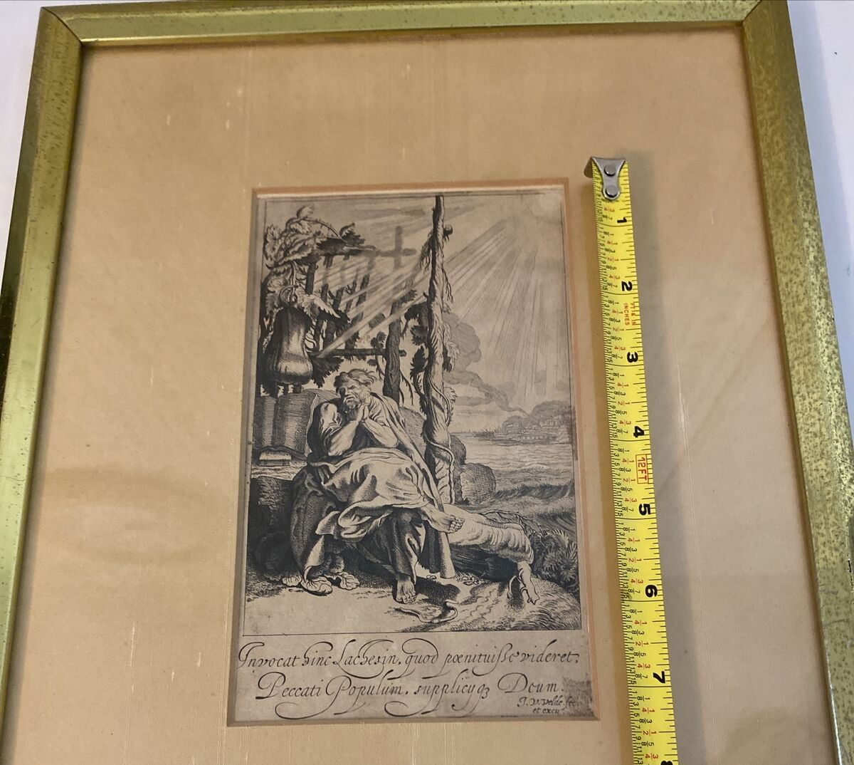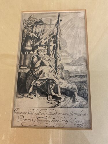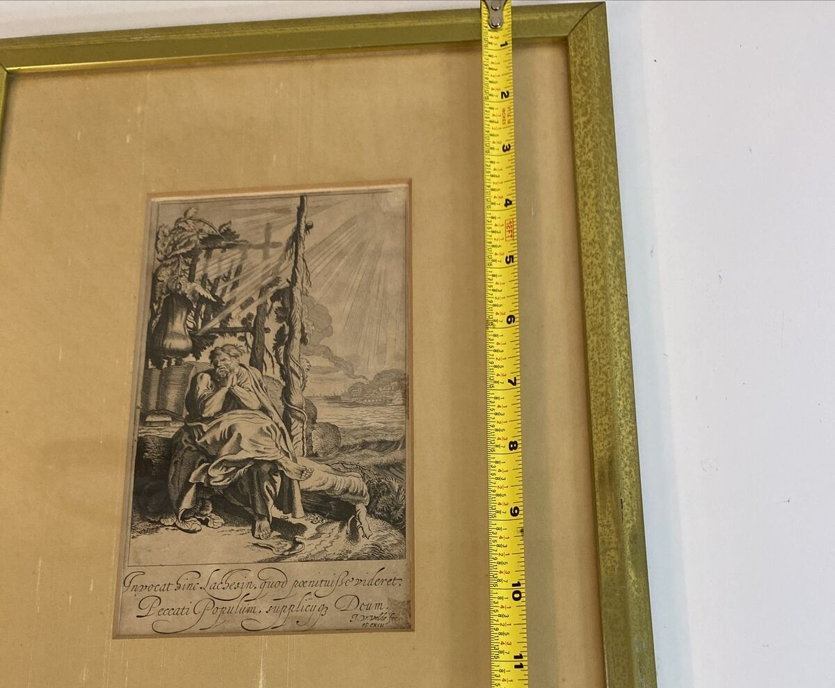 This antique print features a captivating image of Jonah Sitting under the Gourd, created by the talented artist Jan van de Velde II (1593-1641). The artwork measures 4 1/4 inches in length and 7 1/2 inches in width, and is an original piece that has been expertly framed. The production technique used for this etching was handmade and it was created before the year 1700. The subject of the artwork is Jonah, and the theme is art.