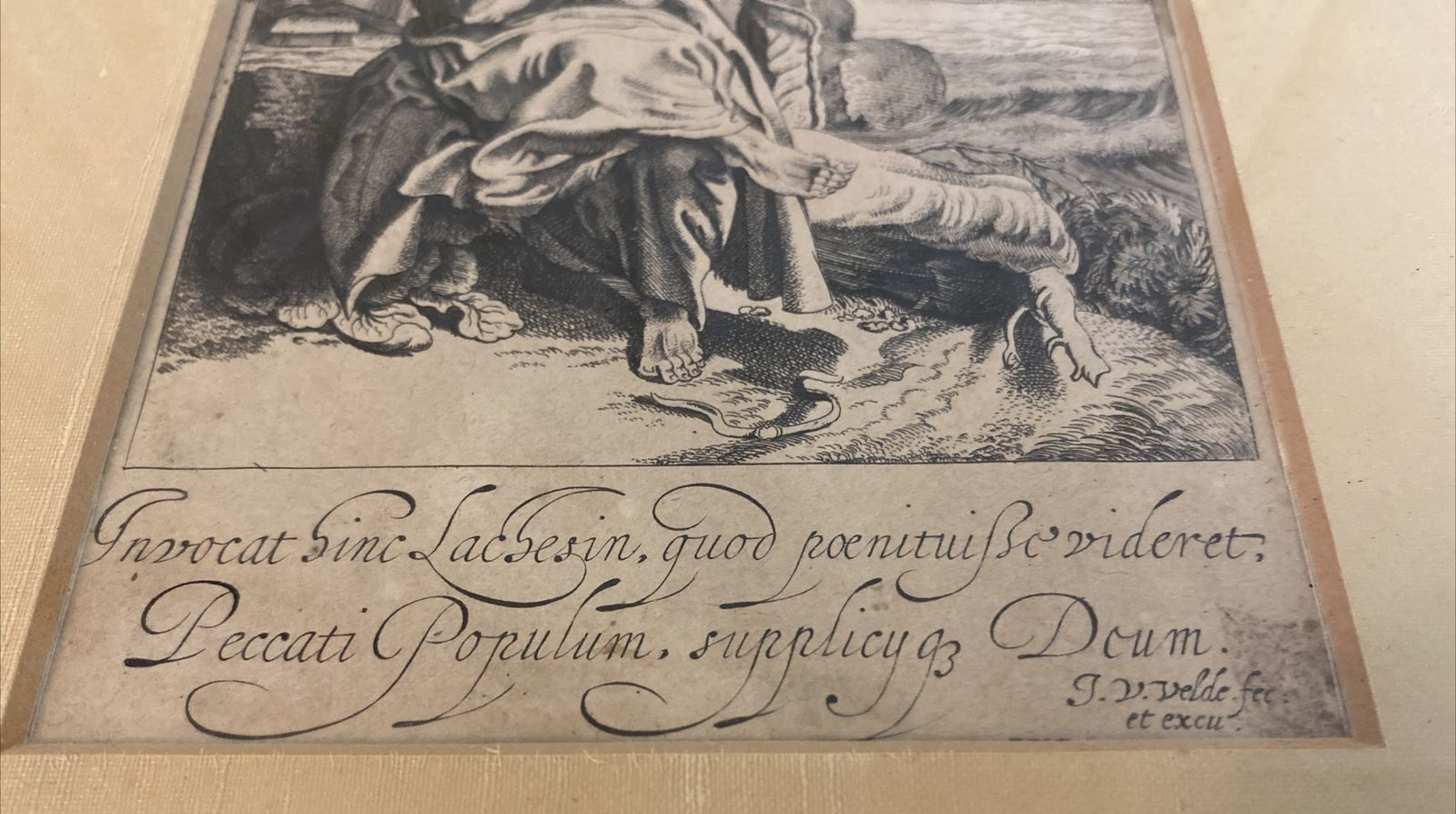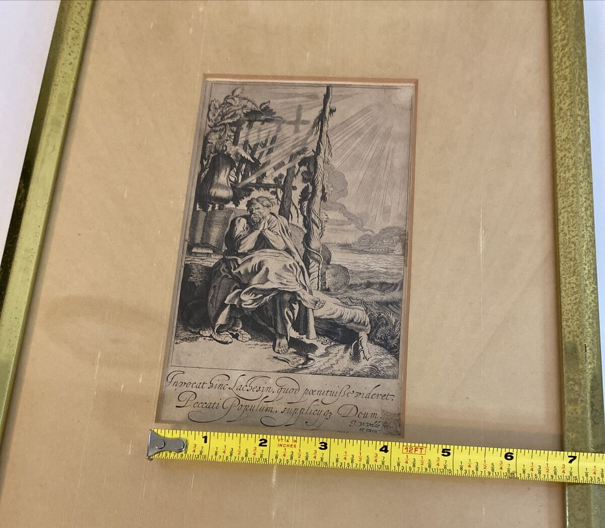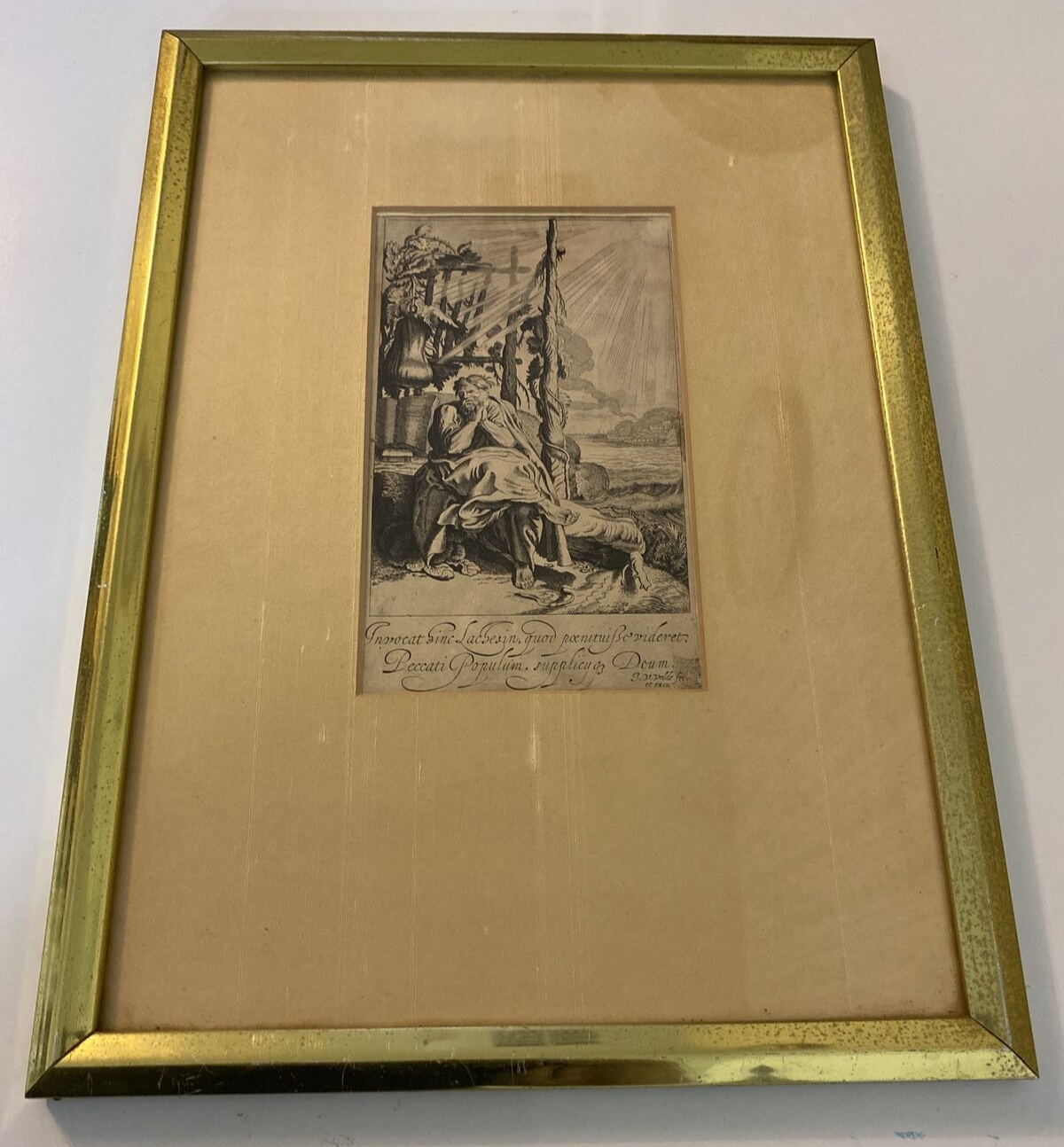This antique print features a captivating image of Jonah Sitting under the Gourd, created by the talented artist Jan van de Velde II (1593-1641). The artwork measures 4 1/4 inches in length and 7 1/2 inches in width, and is an original piece that has been expertly framed. The production technique used for this etching was handmade and it was created before the year 1700. The subject of the artwork is Jonah, and the theme is art.