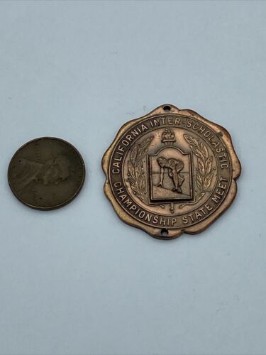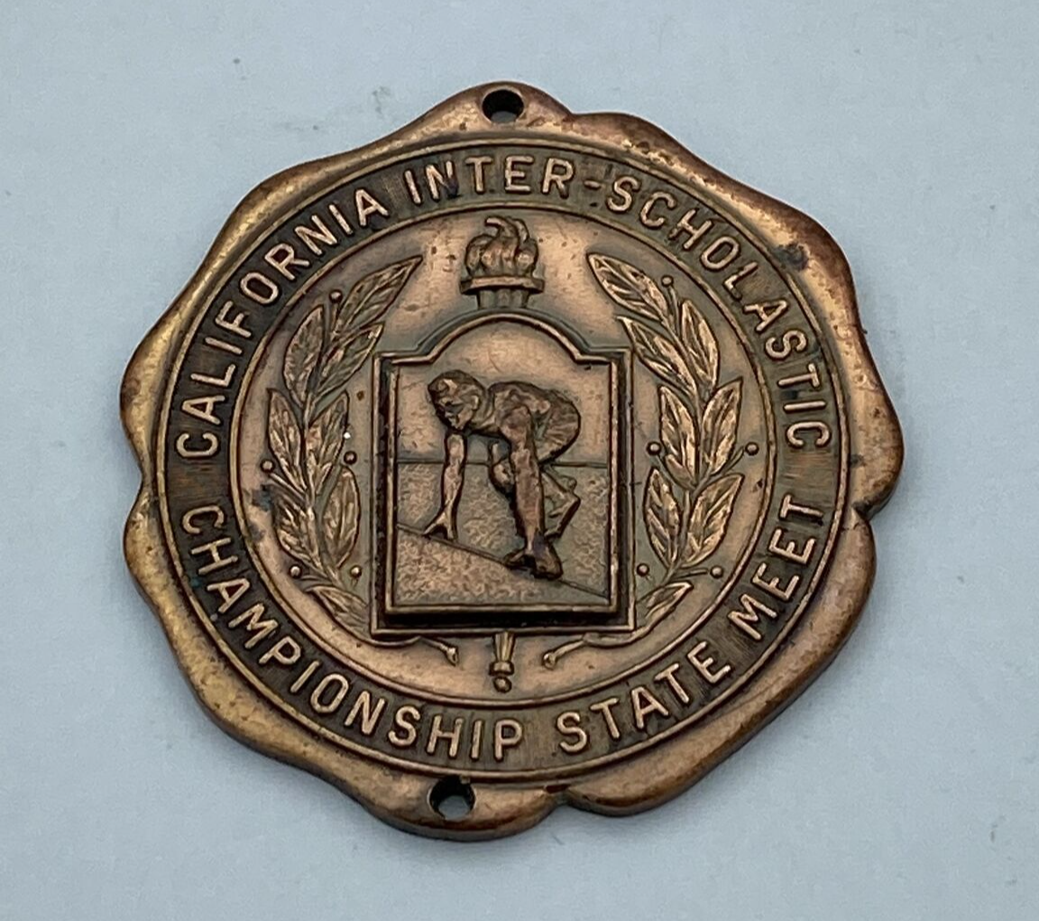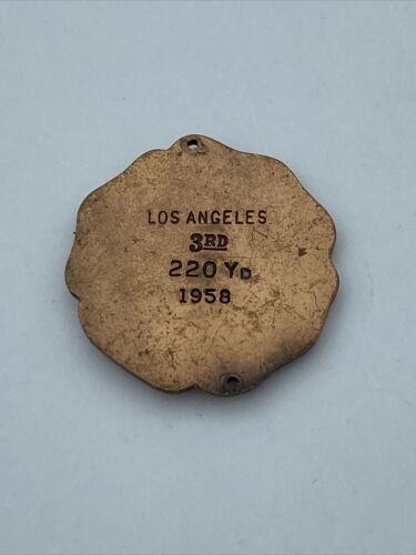 Own a piece of history with this rare California Interscholastic Championship State Meet 1958 Running Medal. This medal is a bronze-colored medal and was awarded to the 3rd place winner in the 220 yard race. It is an excellent addition to any medal or sports memorabilia collection.