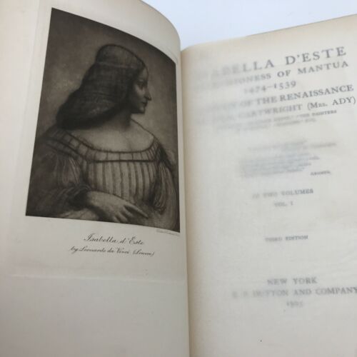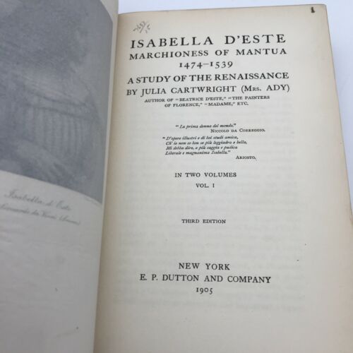 CartwrIght Isabella D’Este Marchioness 1474-1539. It id dated 1905 as the 3rd Edition. Both books have a beautiful fine binding.