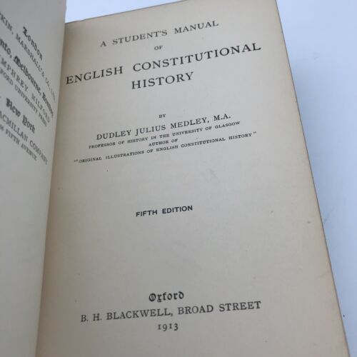 The English Constitutional History. The author Dudley Julius Medley. It is the fifth edition dated 1913. The book comes from the prestigious Merchant Taylors School in England.