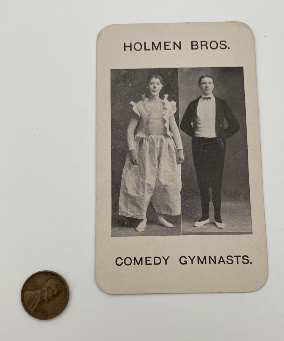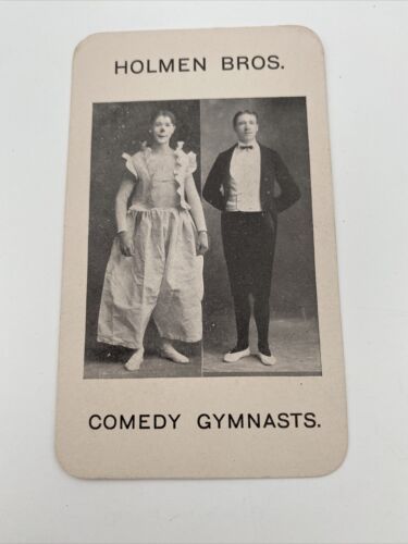 Holmen Brothers Comedy Gymnasts Advertising Card is a vintage promotional card from the early 1900s. The card features a circus theme and showcases the comedic gymnastics of the Holmen Brothers. The brand, Holmen Brothers, is prominently displayed on the card. The type of advertising is a card, likely distributed as a collectible or promotional item.