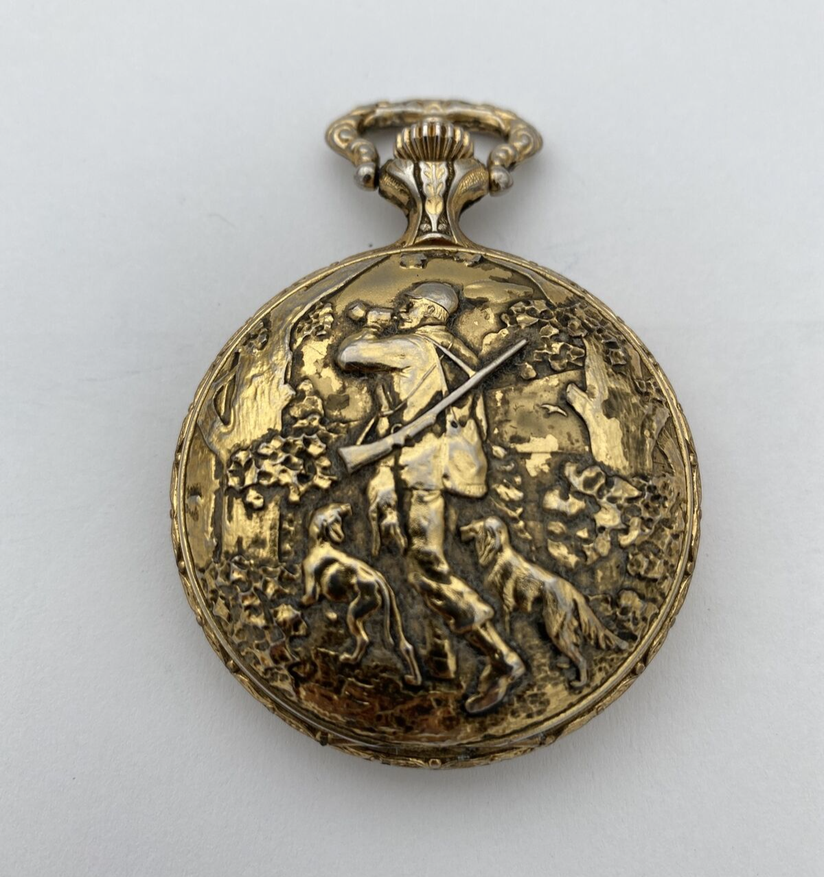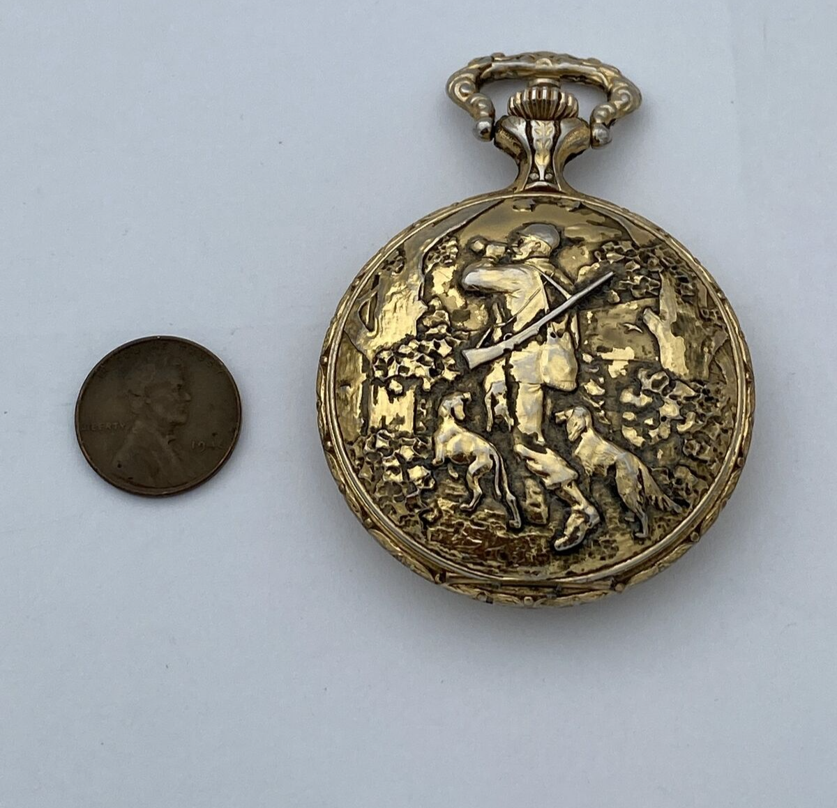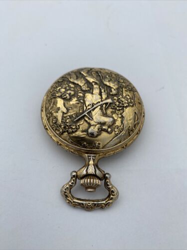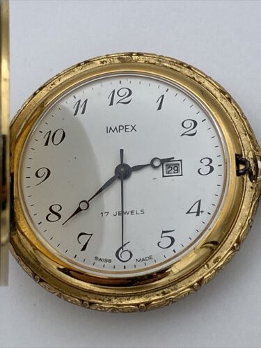 This Impex Collection pocket watch is a stunning vintage timepiece with a gold tone case and a white dial featuring Arabic numerals and a dog hunting theme. It is a men’s dress/formal watch with a full hunter closure and a snap caseback. The watch has a mechanical (manual) movement with 17 jewels and is shock-resistant. It also features a seconds hand and easy-to-read large numerals, making it perfect for everyday wear. The watch comes with its original box/packaging and is Swiss-made. The Impex Collection pocket watch is a unique and stylish addition to any watch collection.