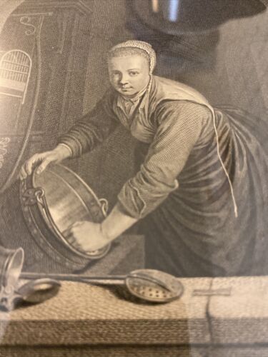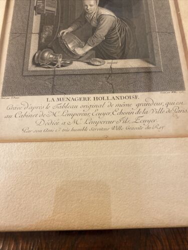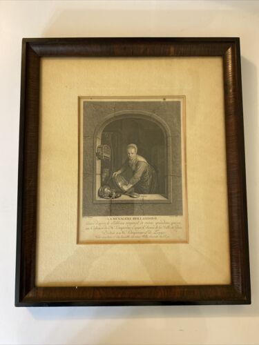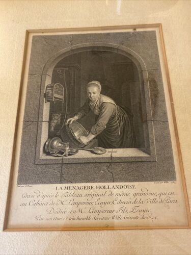 This beautiful engraving titled “La Menagere Hollandoise” depicts a domestic scene from Dutch history. Produced in 1757 by Johann Georg Wille using the etching technique, this original piece captures the daily life of a Dutch housewife. The intricate details and use of ink bring the scene to life and make it a must-have for any art collector interested in social history and domestic life themes. The artist’s skillful execution in this Dutch style engraving is evident in every stroke.