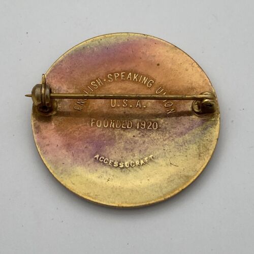 The badge is equipped with a horizontal pin and a come-under locking swivel catch, ensuring secure attachment. It proudly bears the inscription “ENGLISH SPEAKING UNION U.S.A. FOUNDED 1920 ACCESSOCRAFT,” marking its authenticity and historical significance.