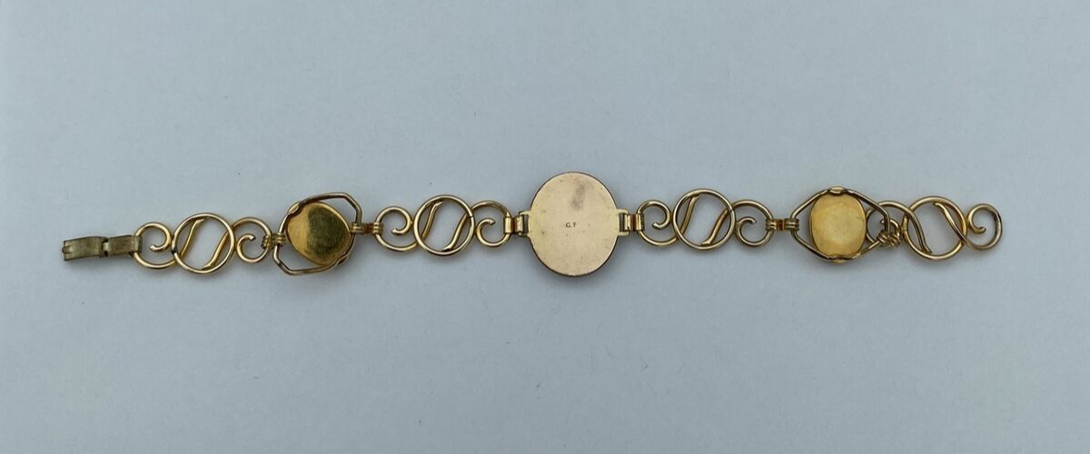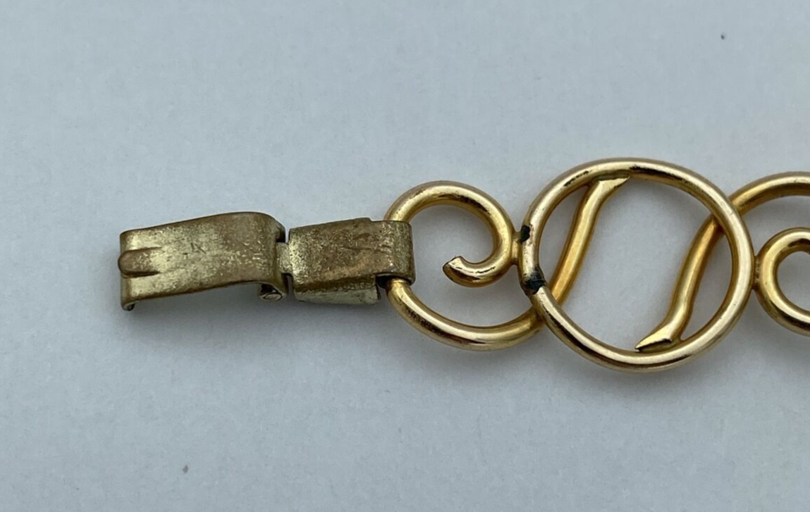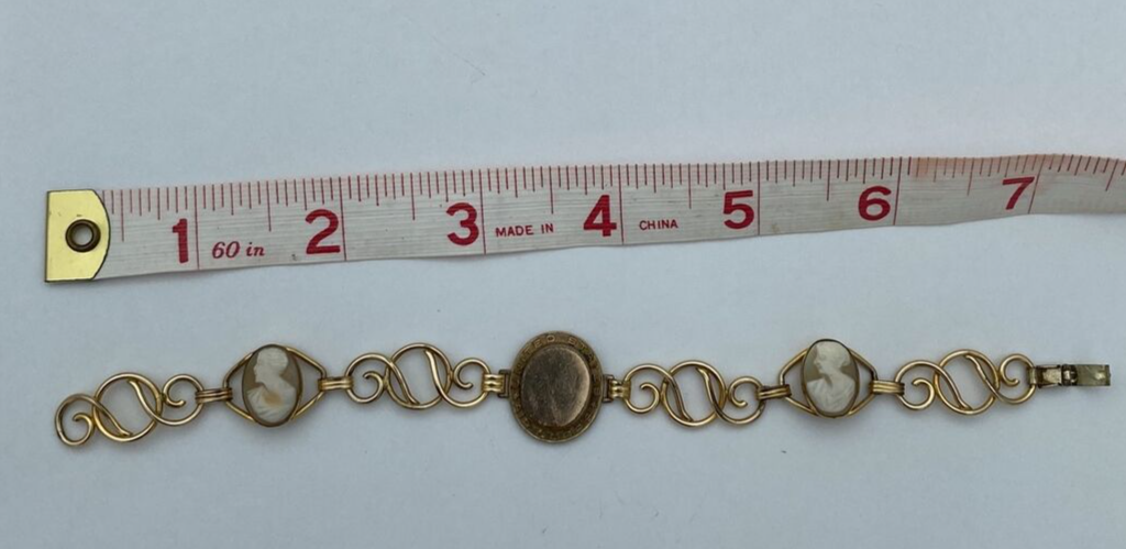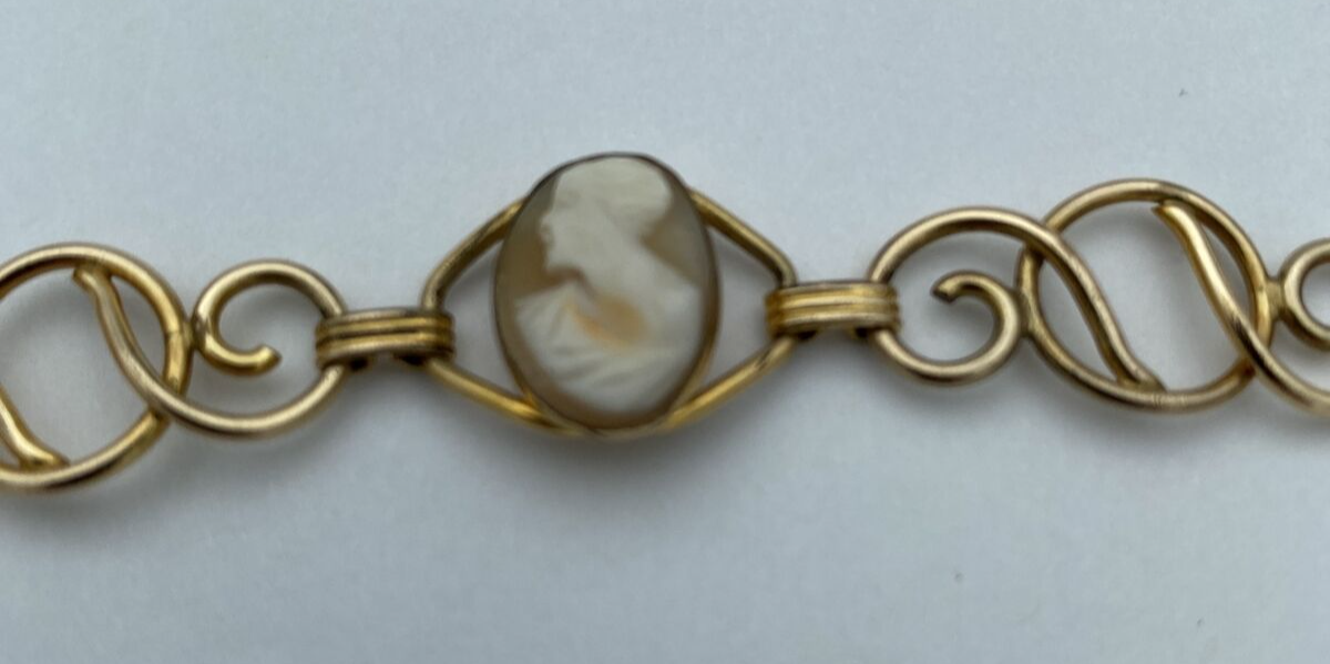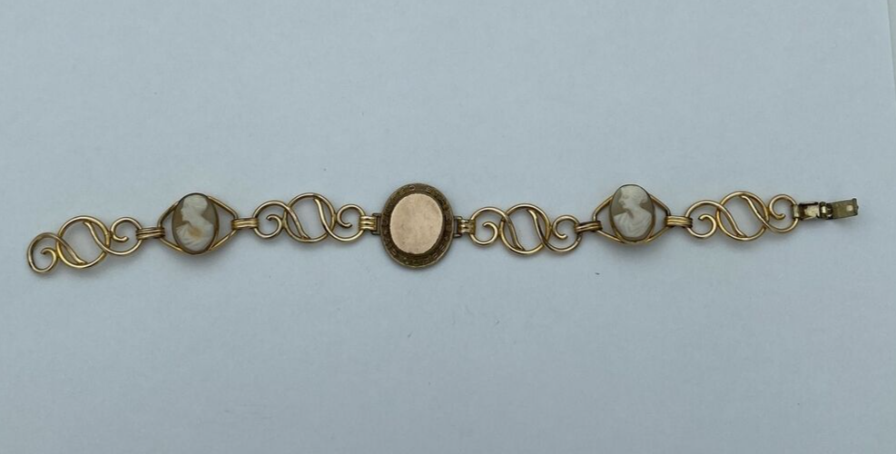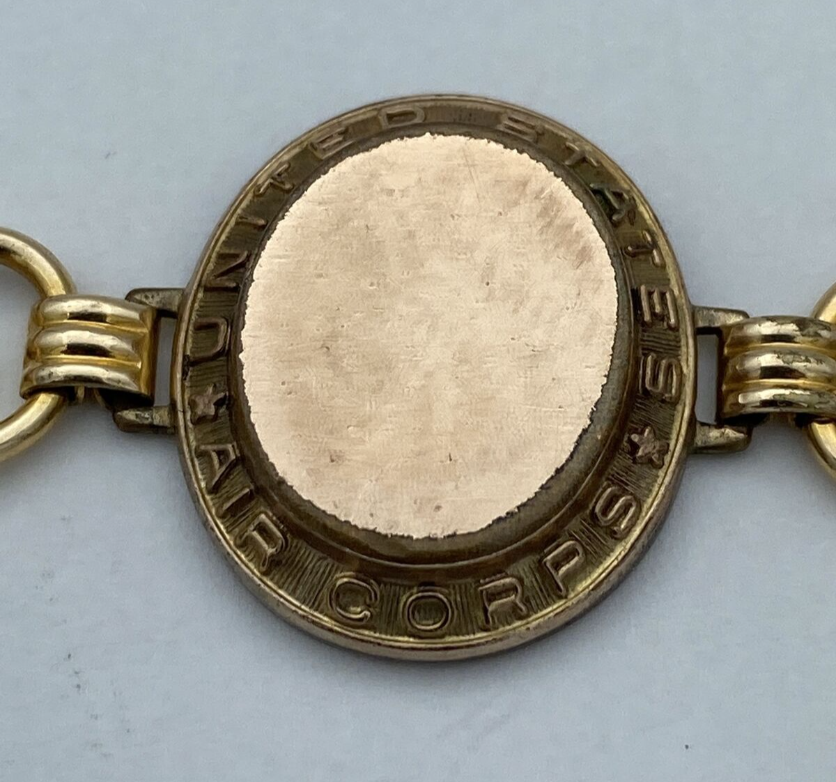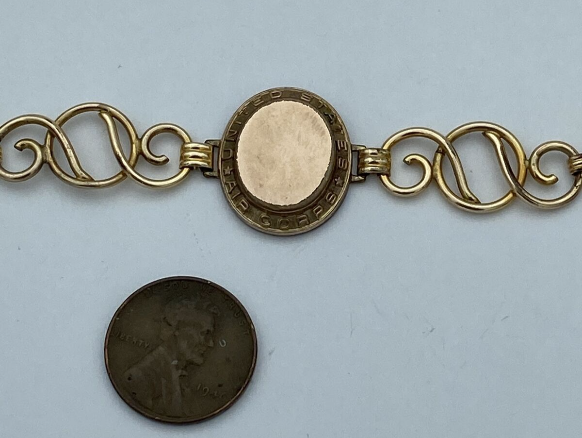 This stunning bracelet features beautifully carved cameos of left-facing soldiers from the US Army Air Corps, a beloved symbol of American military history potentially during World War II. The bracelet is made of high-quality gold-filled material, and is in excellent vintage condition. With its intricate craftsmanship and timeless design, this piece of militaria memorabilia is a true collector’s item. Whether you’re a history buff, a militaria enthusiast, or simply looking for a unique and meaningful accessory, this sweetheart bracelet is sure to make a statement. Add it to your collection today!