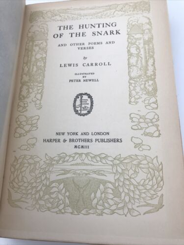 This is a rare book from Harper & Brothers, New York, 1903. Hardcover. Peter Newell’s illustrations grace the first edition. White paper with gilded boards. The Carroll story is wonderfully suited to Newell’s quirky illustrations.