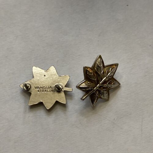 This is a rare and valuable matched set of Major Silver Oak Leaf Military Insignia. The insignia is made of sterling silver and showcases intricate details. The set is perfect for collectors of Militaria items and those interested in military history. The Vanguard V-21-N insignia set is made in the United States and is designed with utmost precision. This item is a must-have for enthusiasts and is a great addition to any collection.
