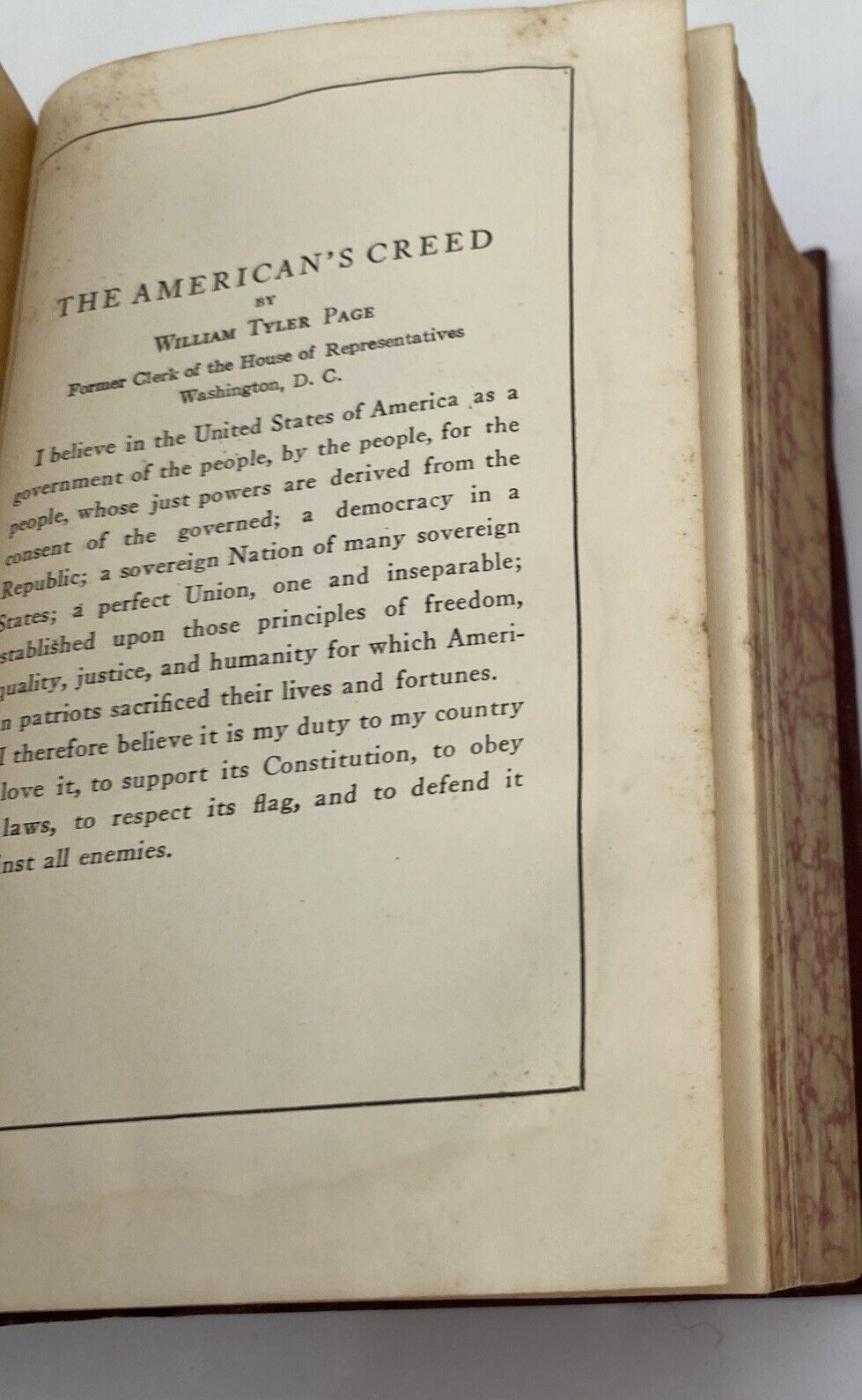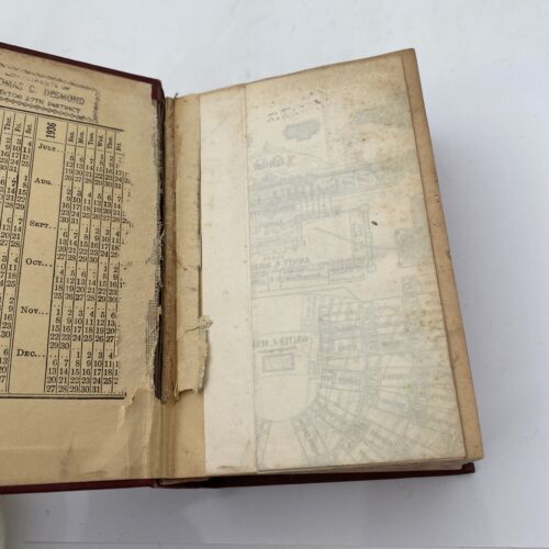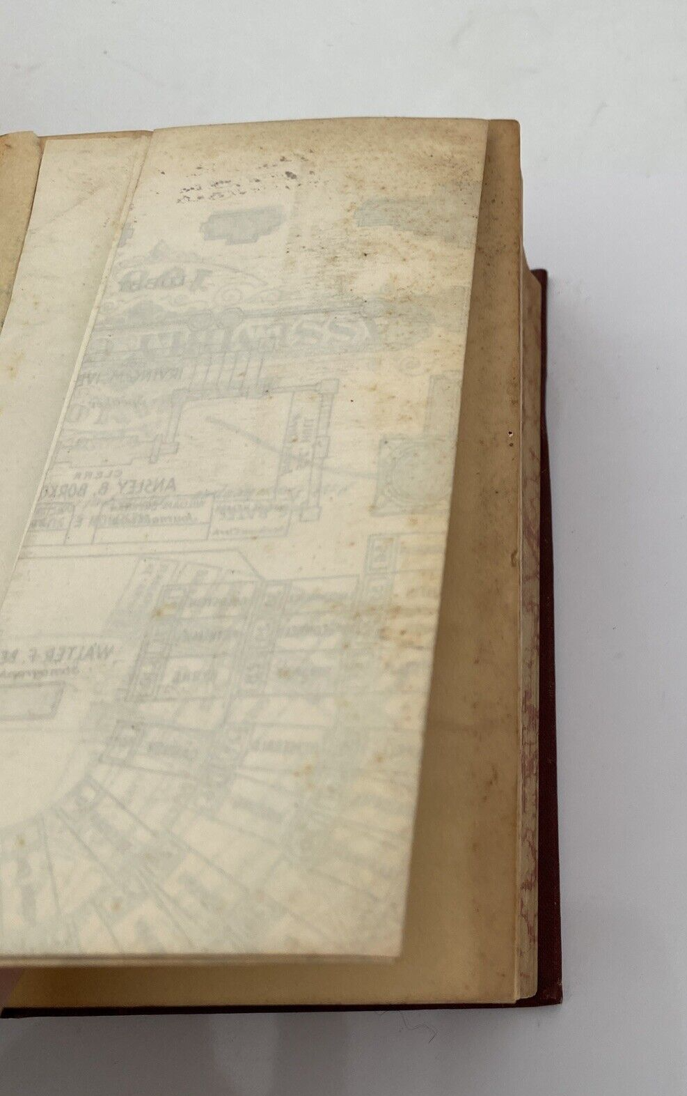 The assembly chamber is present. There is some foxing and a light water(s) stain. The front board joint is broken, but the board is still attached.