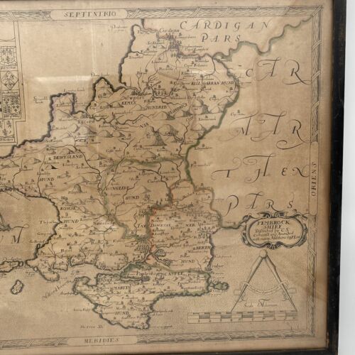 Christoper Saxton’s old county map of Pembrokeshire, “Corrected and Amended with Many Additions by P.Lea.” Lea added town plans for Pembroke and Haverfordwest, heraldic shields, and highways extracted in various ways from John Speed and John Ogilby’s maps to the plates, which were printed from the original Christopher Saxton copper plate. Circa 1690.