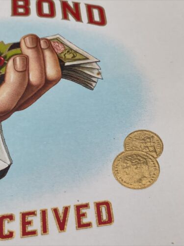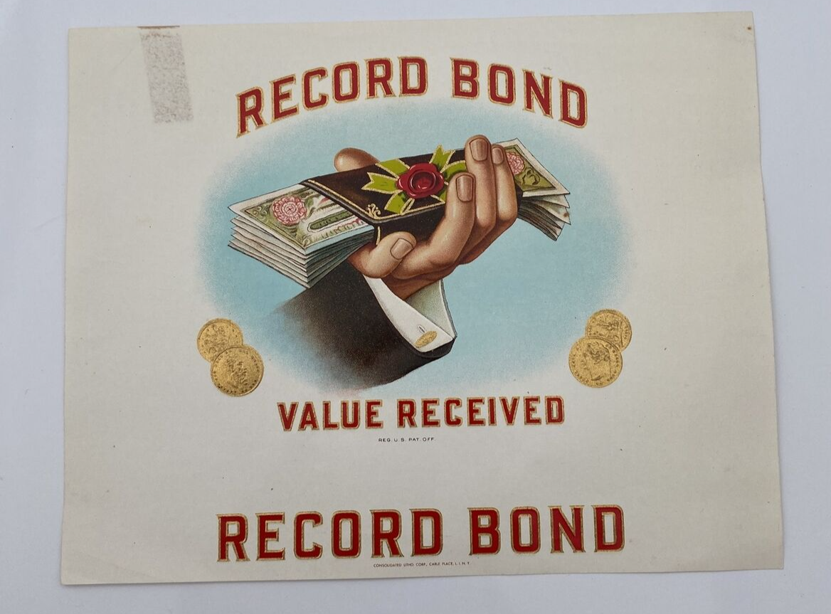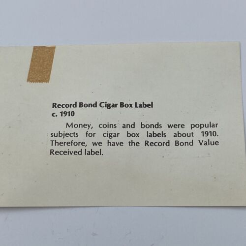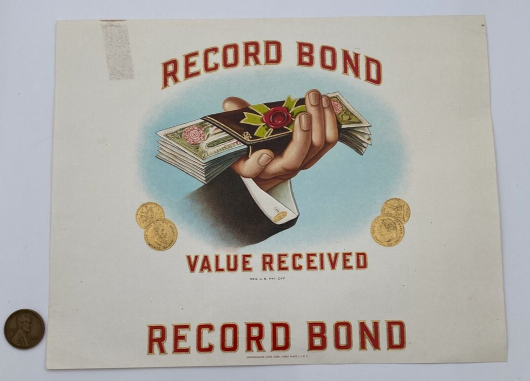 This is an authentic record bond original cigar label from around 1900. The label was manufactured in the United States and is a unique piece of history. It features the record bond logo and is perfect for collectors of tobacciana and cigar labels. The label is in great shape and is a wonderful addition to any collection.