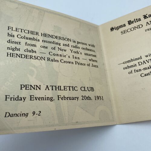This rare and unique item is a 1931 invitation to the Sigma Delta Kappa event hosted by the Penn Athletic Club. The invitation features the name of the band leader, Fletcher Henderson, and is a must-have collectible for fans of Fraternity & Sorority memorabilia.