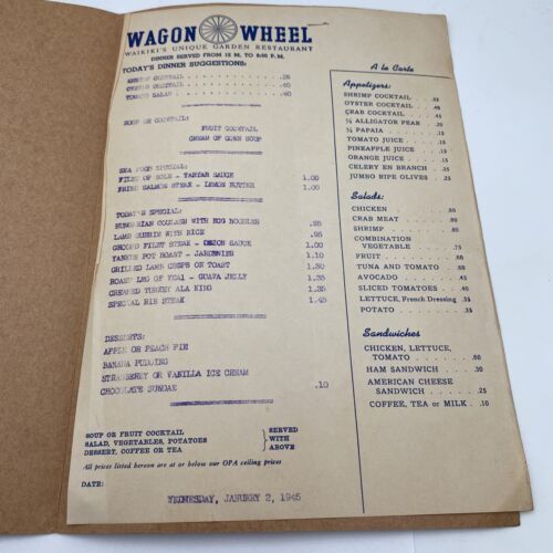 Restaurant Menu / WAGON WHEEL Waikiki’s Unique Garden Restaurant 1945 WWII – Hawaii