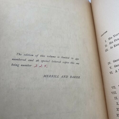 Hard cover, blue cloth gilt decoration, this edition #’d 225 of 450, tissue covered frontispiece & several illustrations, rough cut edges. There’s a gift inscription (see photos). There is shelf wear and some foxing.