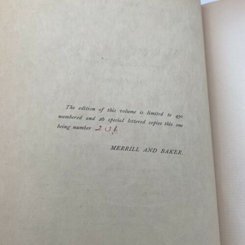 Hard cover, blue cloth gilt decoration, this edition #’d 236 of 450, tissue covered frontispiece & several illustrations, rough cut edges. There’s a gift inscription (see photos).