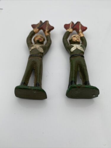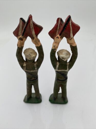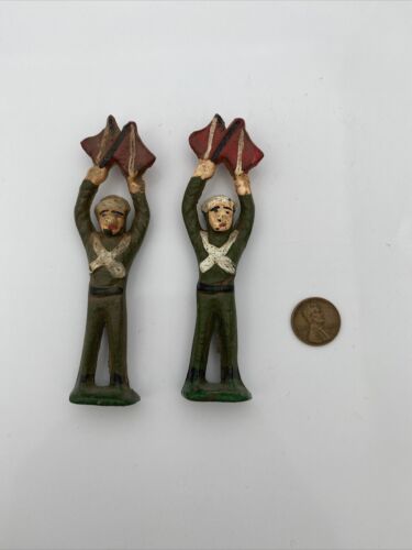 Add to your collection with these two vintage Barclay toy lead soldiers figures. These sailors come with signal flags and are perfect for any military enthusiast. Made in the United States, these figures are sure to be a unique addition to your toy collection. The brand, Barclay, is well-known for producing high-quality toy figurines, and these are no exception.