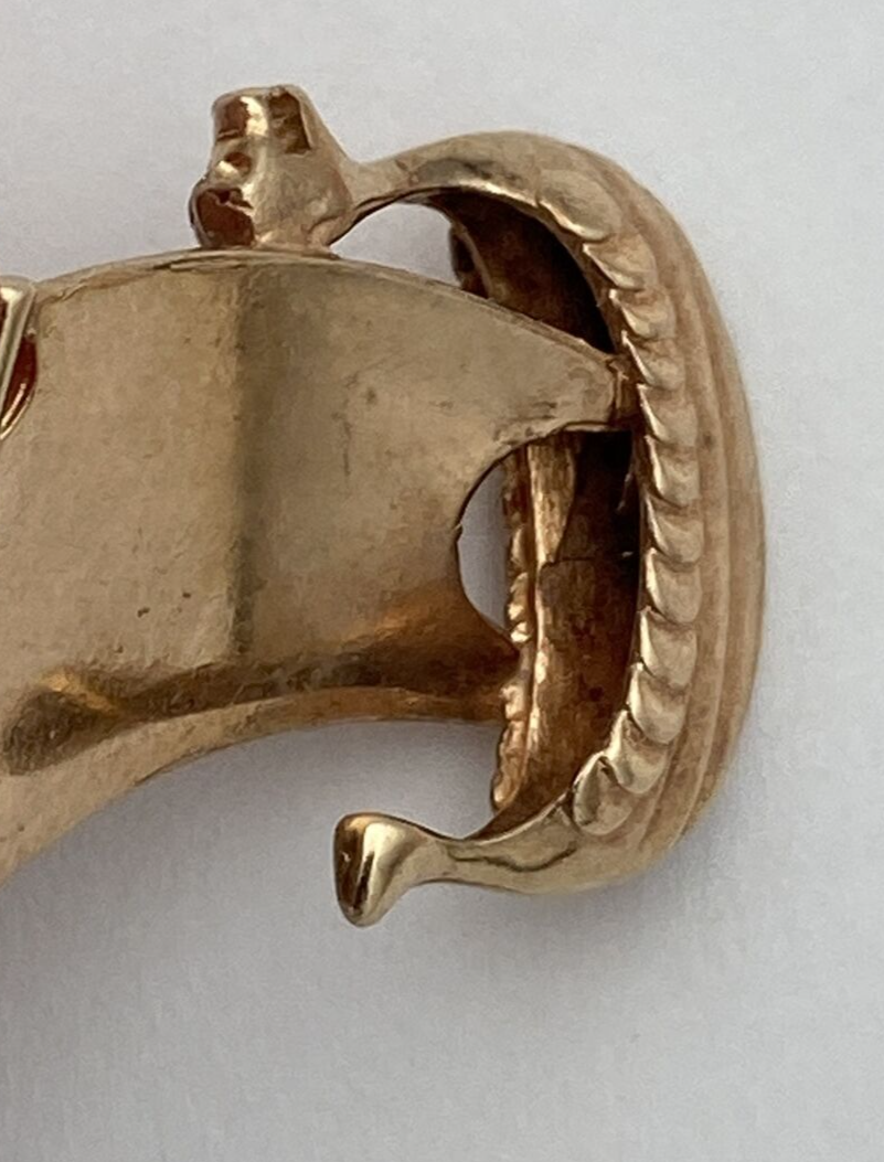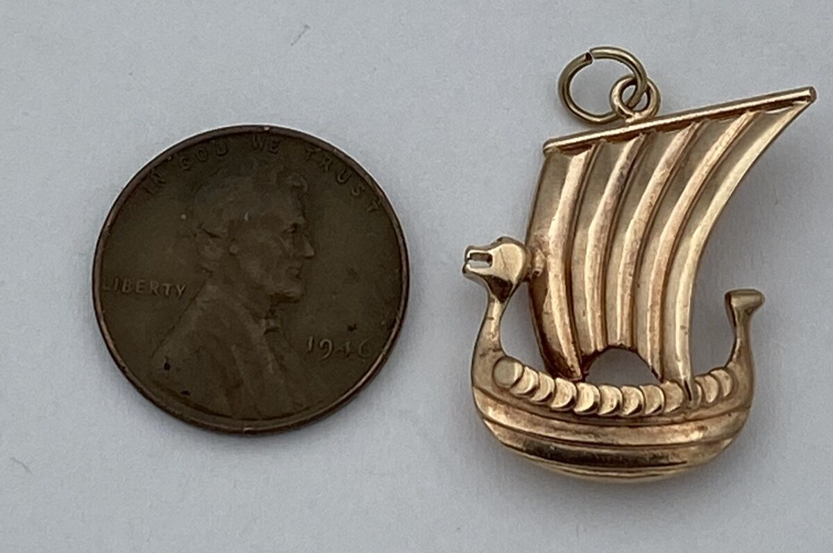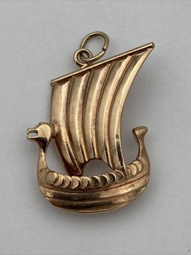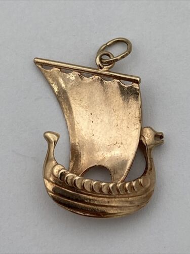 Add a touch of Viking spirit to your jewelry collection with this stunning vintage 14K yellow gold pendant/charm. This piece features a detailed 3D design of a Viking pirate ship, complete with intricate details and a striking yellow gold finish. The pendant is perfect for attaching to your favorite necklace or bracelet, and its unique charm design makes it a great addition to any jewelry collection. Whether you’re a fan of transportation themes or simply love the beauty of yellow gold, this pendant is sure to impress.