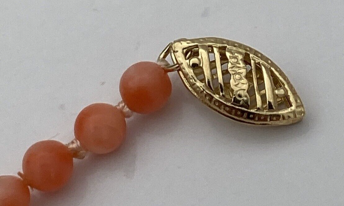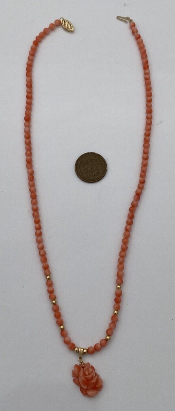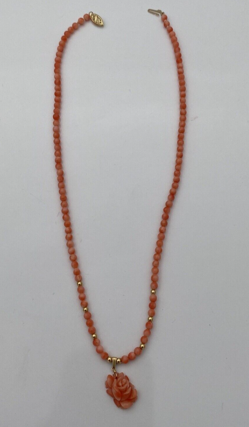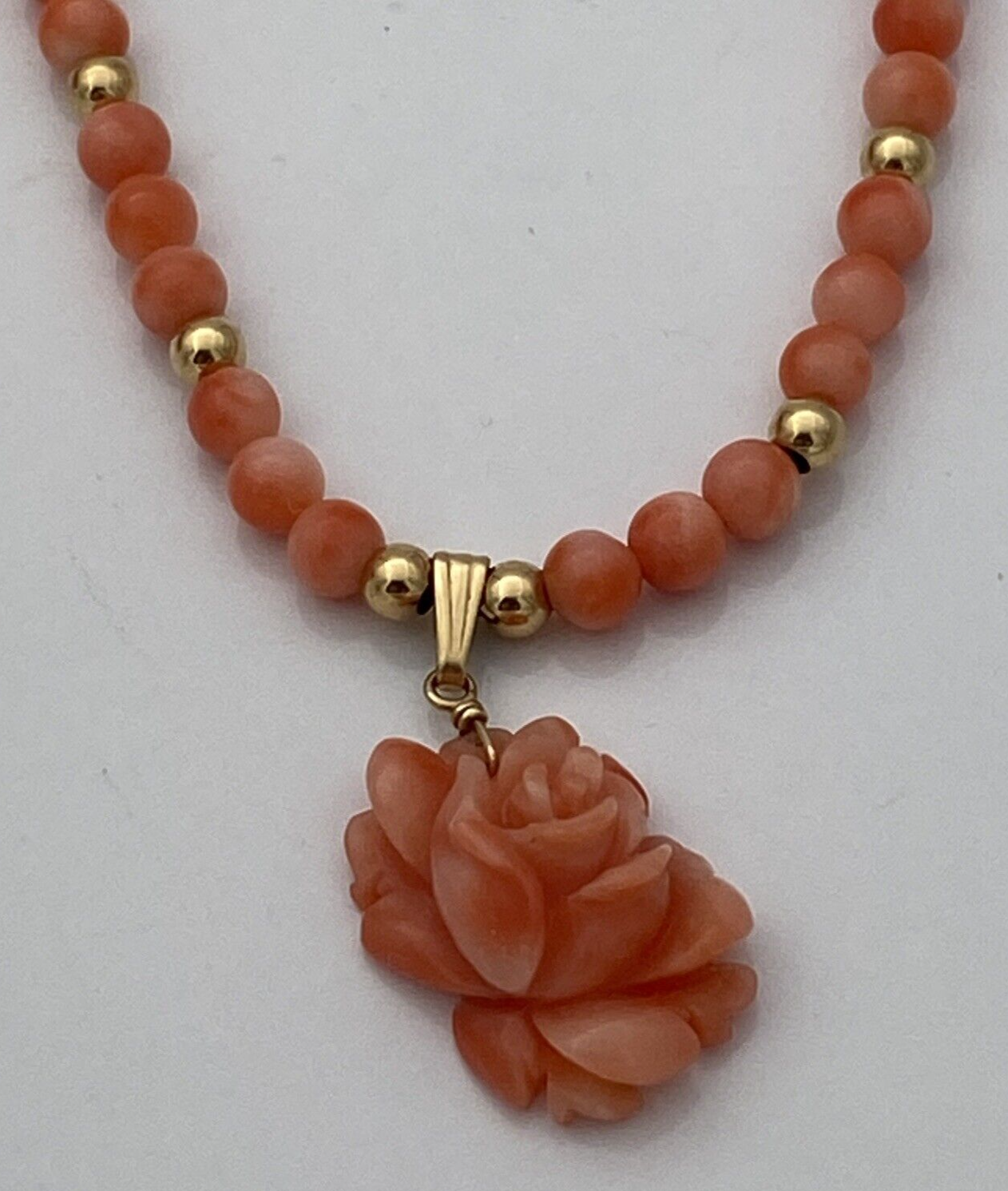 A beautiful vintage Angel Skin coral necklace with a carved rose pendant. The necklace is approximately 17 inches long. The clasp is 14k gold. It weighs 10.4 grams.