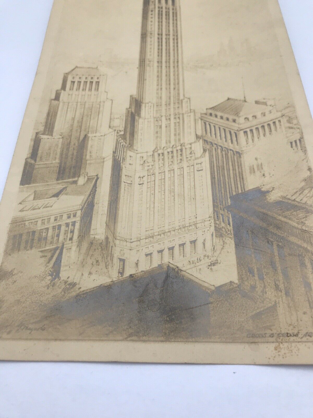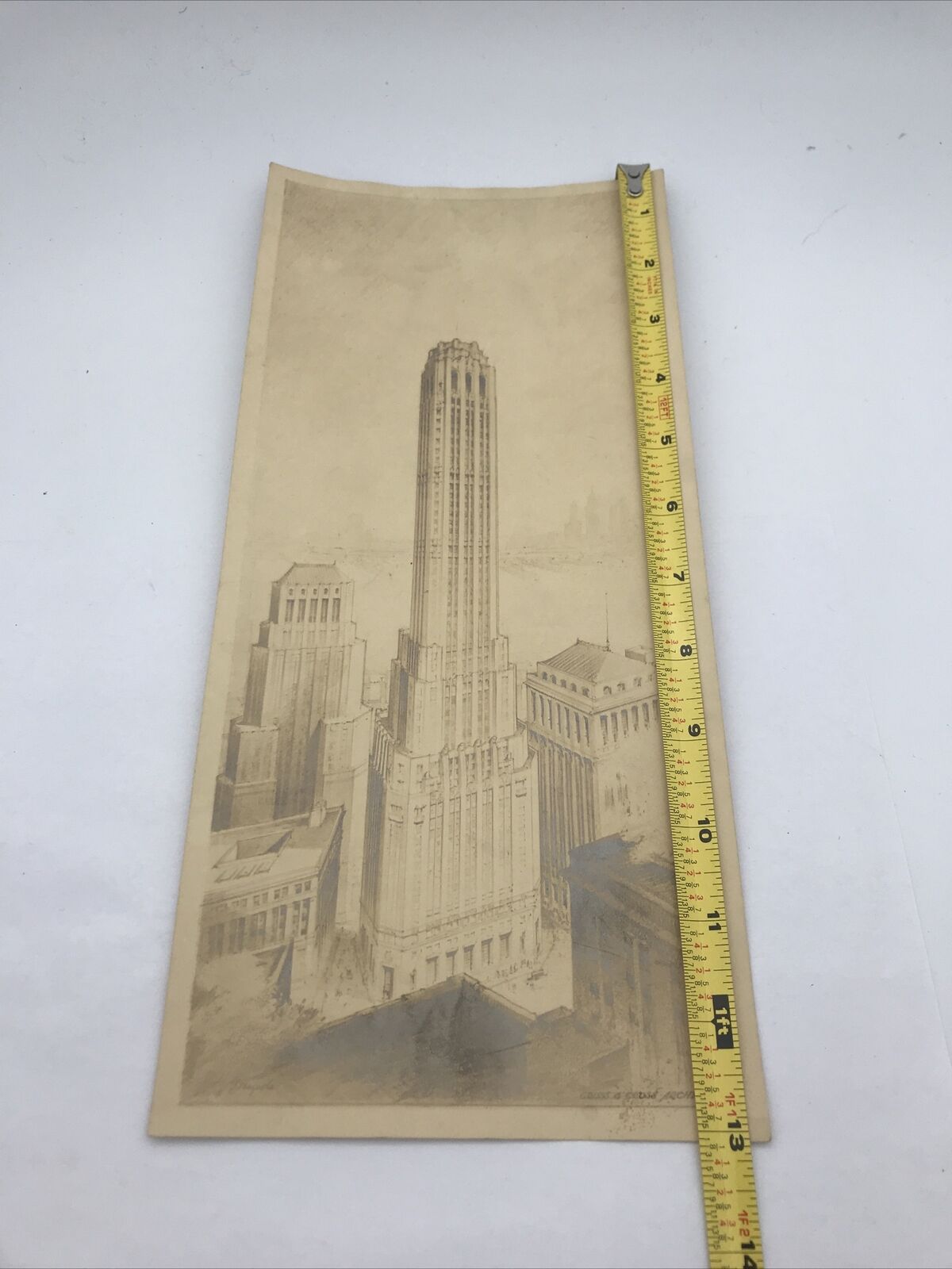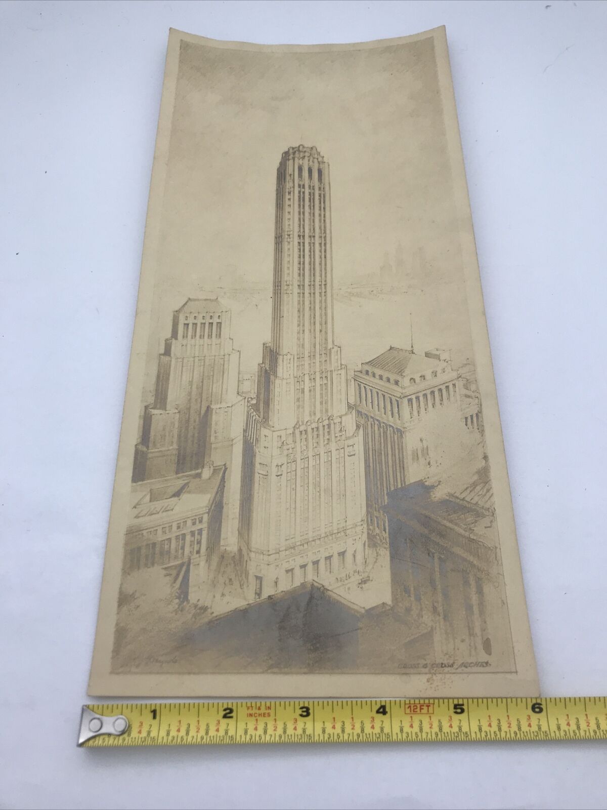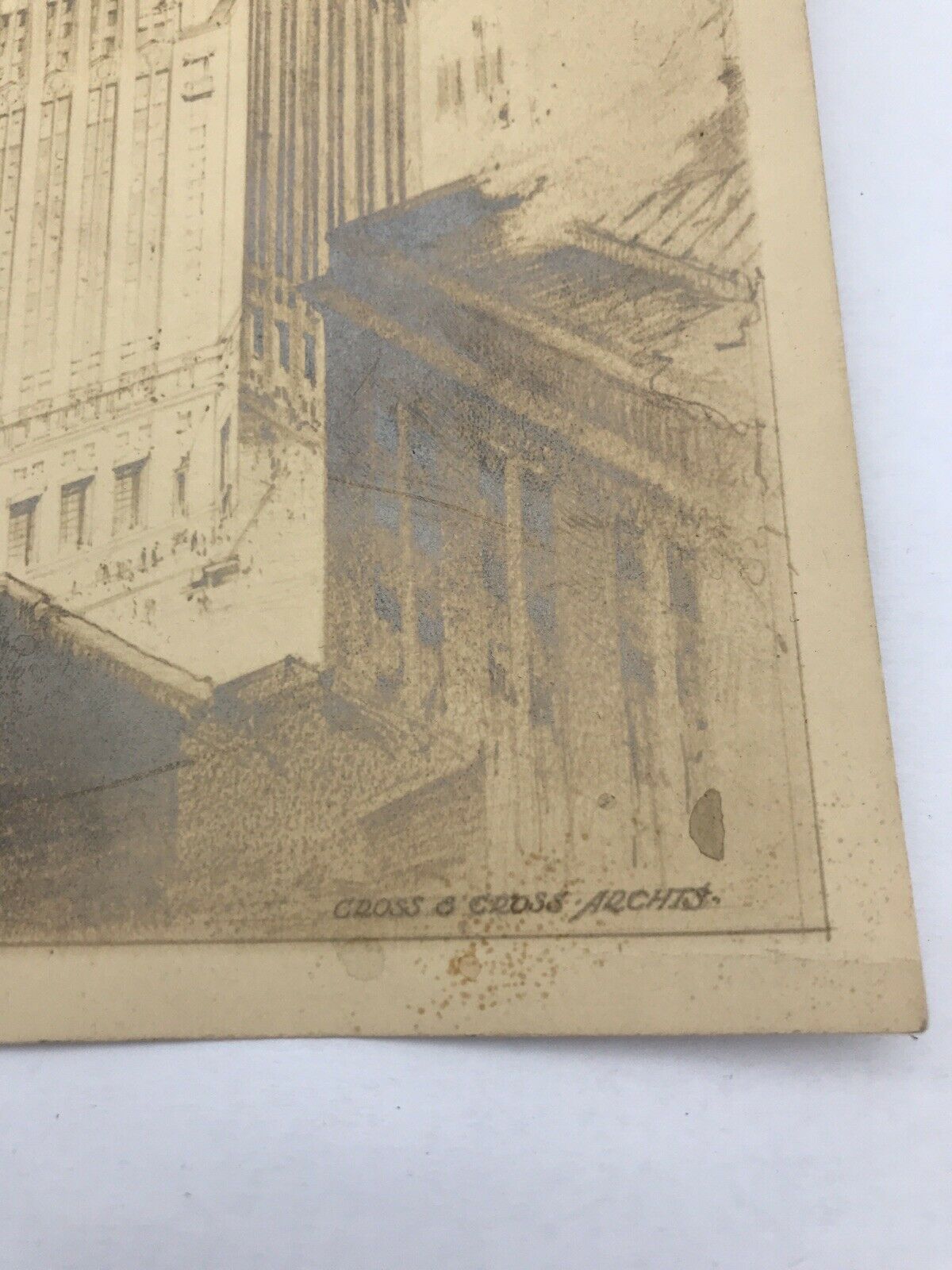 A vintage architectural drawing of 20 Exchange Place in NYC. The architectural firm is NYCs Cross & Cross (bottom right). George Maguolo is the chief designer and is noted on the bottom left of the drawing. This skyscraper was completed in 1931 and was known as the City Bank-Farmers Trust Building. We believe the drawing is from the late 1920s. It is approximately 13 by 6 inches.