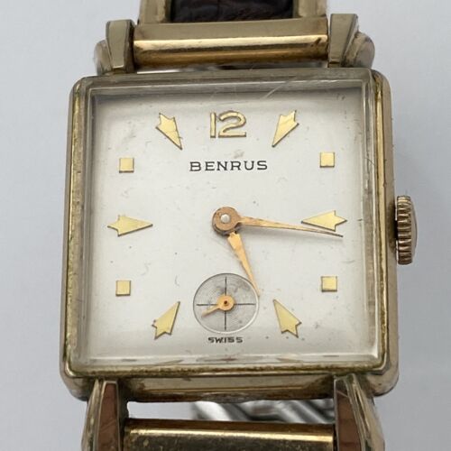 This vintage Benrus wristwatch is a stylish accessory for any man. The watch features a mechanical movement, which requires manual winding, and an analog display. The gold color and 10k rolled gold plate bezel add a touch of luxury to the design. The Hirflex band/strap is comfortable to wear and suits the vintage style of the watch. This watch is perfect for collectors or anyone looking for a unique timepiece.