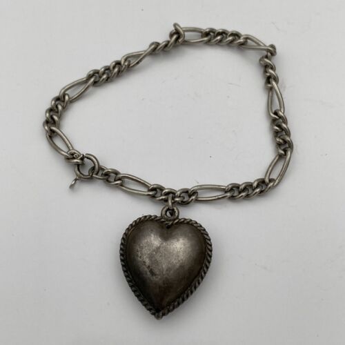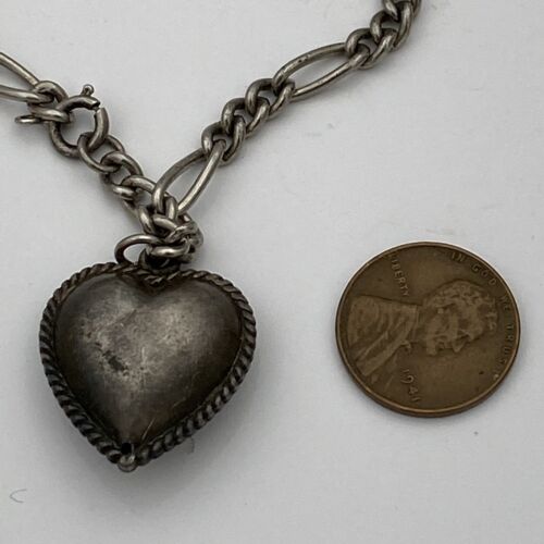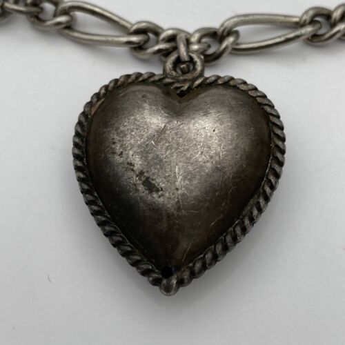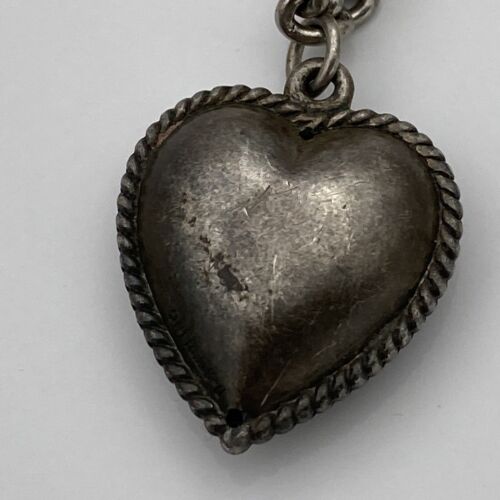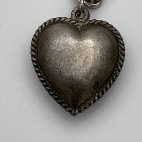 This is a vintage charm made of D-Sterling silver (hollow). The charm is in the shape of a puffy heart with a braided edge design.