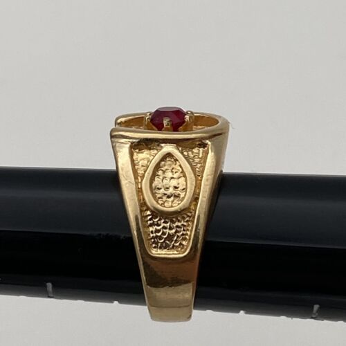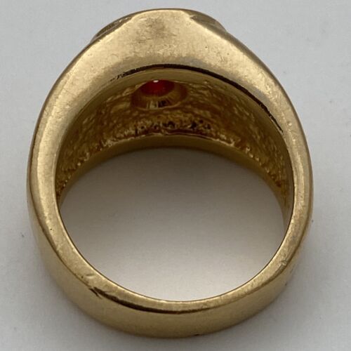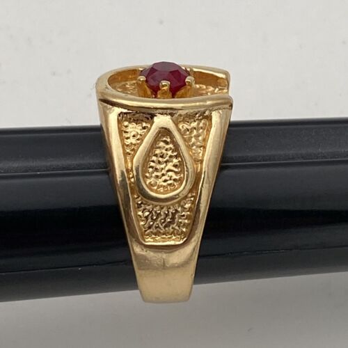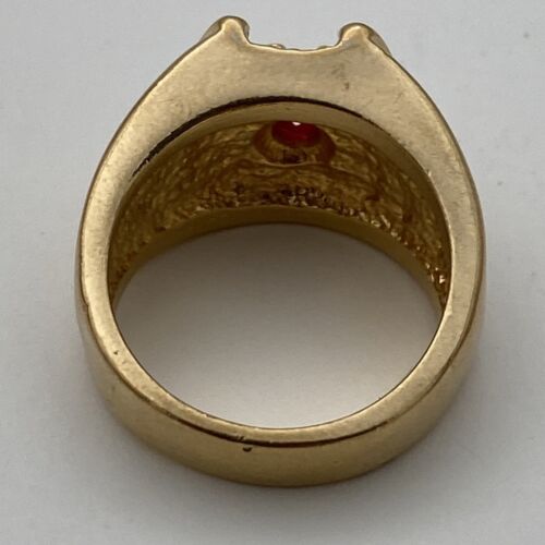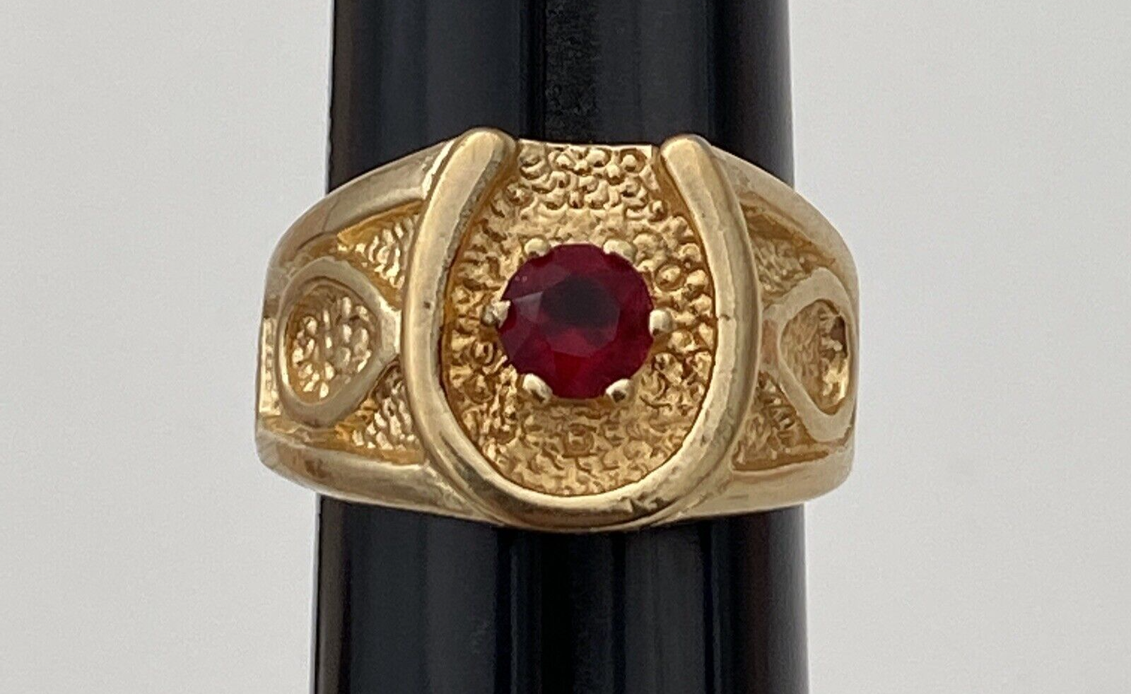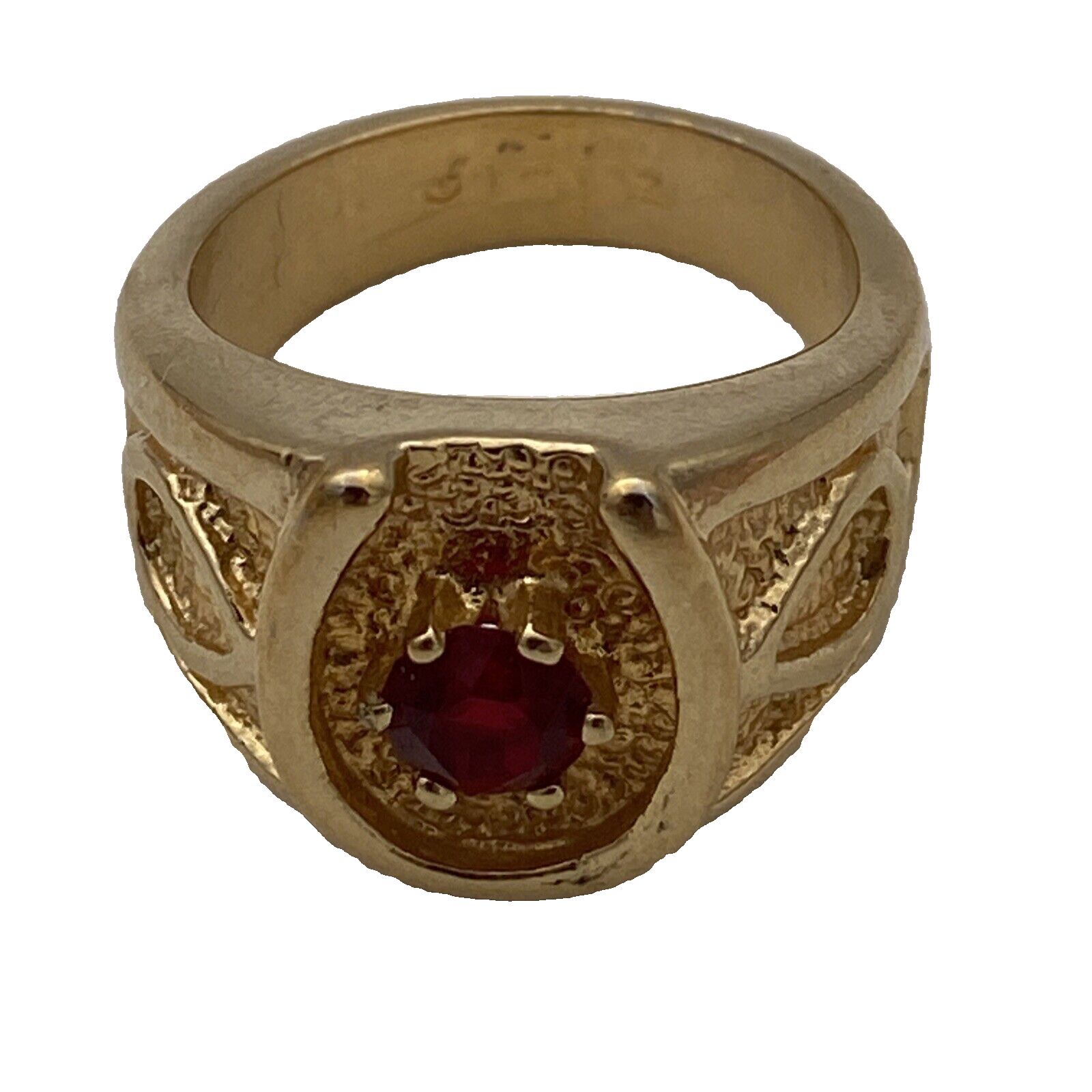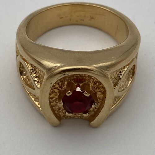 This is a vintage 18k HGE(heavy gold electroplate) gold plated horse shoe ring with a natural garnet stone in size 7. The ring is yellow in color and has a horse shoe shape. It weighs 10 grams.