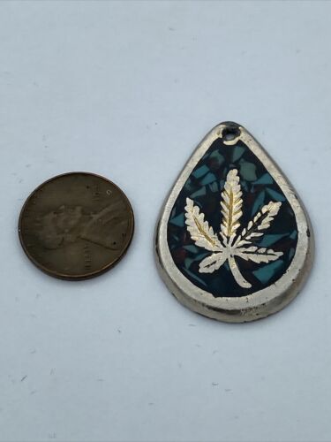 This vintage silver pendant features a beautifully crafted marijuana leaf with inlaid turquoise chips, adding a touch of unique charm to any outfit. The pendant shape is in the form of a leaf and the main stone shape is chip, while the main stone color is a beautiful shade of blue. This piece would make a great addition to any jewelry collection and is perfect for those who appreciate ethnic, regional, and tribal inspired jewelry.