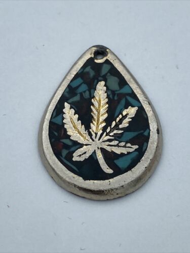 Vintage Inlaid Turquoise Chip and Silver Marjuana Leaf Pendant