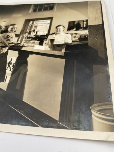 This vintage photograph, taken by renowned photographer William M. Rittase, captures a snapshot of a bustling malt soda shop in the 1940s-50s. The image features a group of women enjoying their drinks and chatting, while the background shows the busy interior of the shop. The photo is a beautiful representation of a bygone era and would make a fantastic addition to any collection. Collect this piece of history!