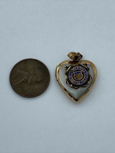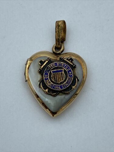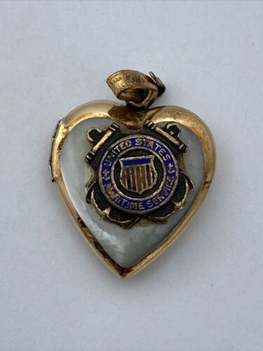 This unique pendant locket is a wonderful piece of history from the WWII era. Made in the United States, it features a heart-shaped design with intricate details. The locket is made of GF 1/20 10k on sterling silver, ensuring its durability and longevity. The pendant is decorated with symbols of the United States Maritime Service, making it a great addition to any militaria collection. This pendant locket is an original piece from the WWII era, and is sure to impress collectors and history enthusiasts alike.
